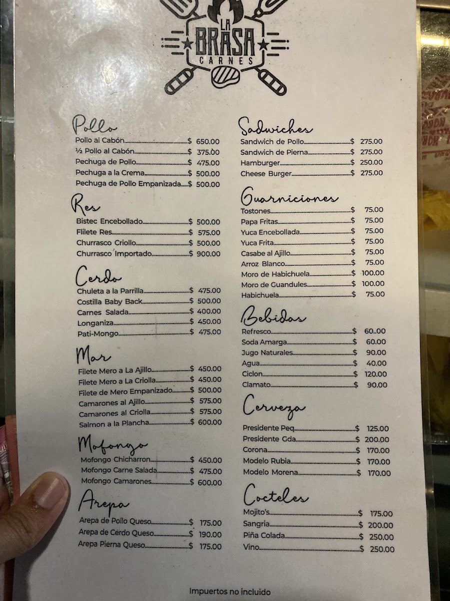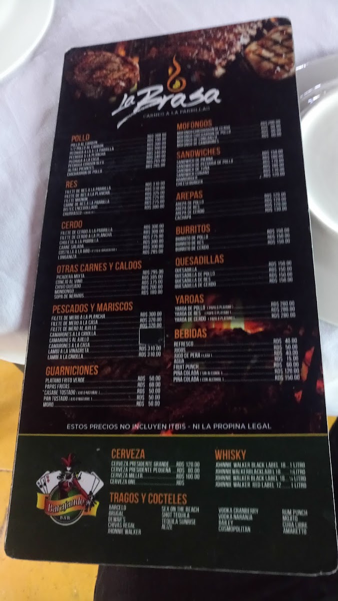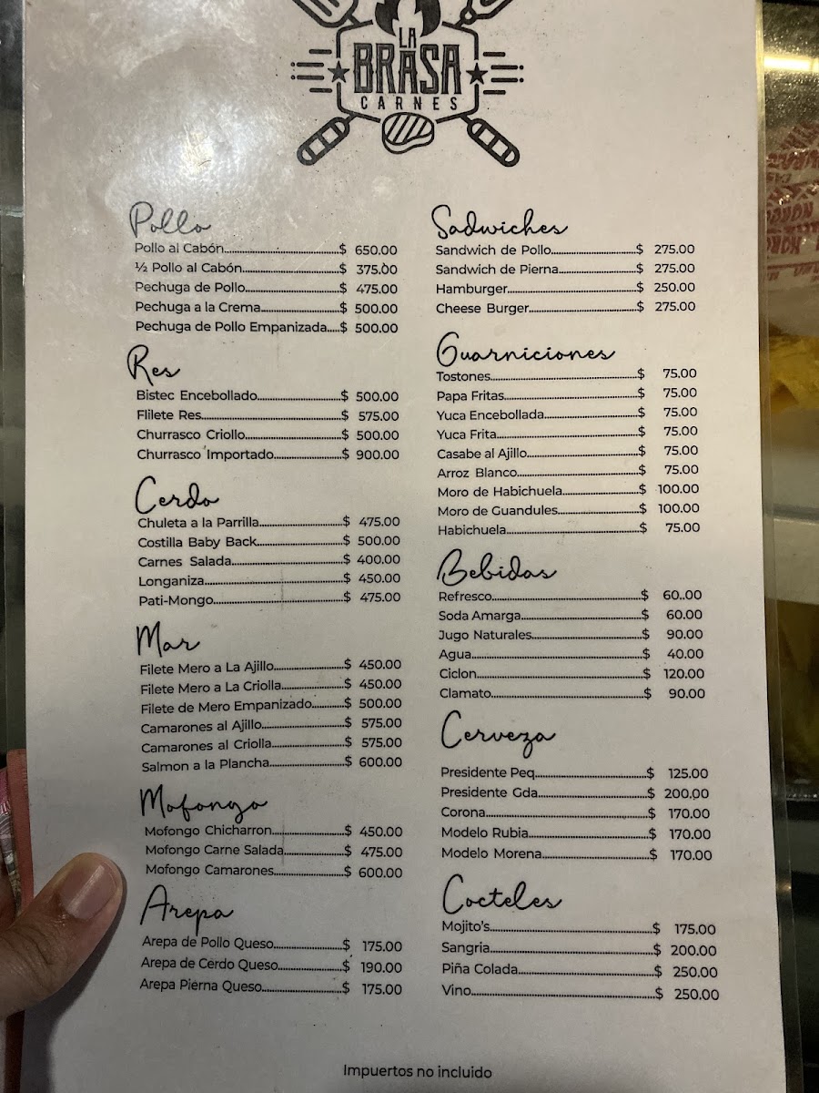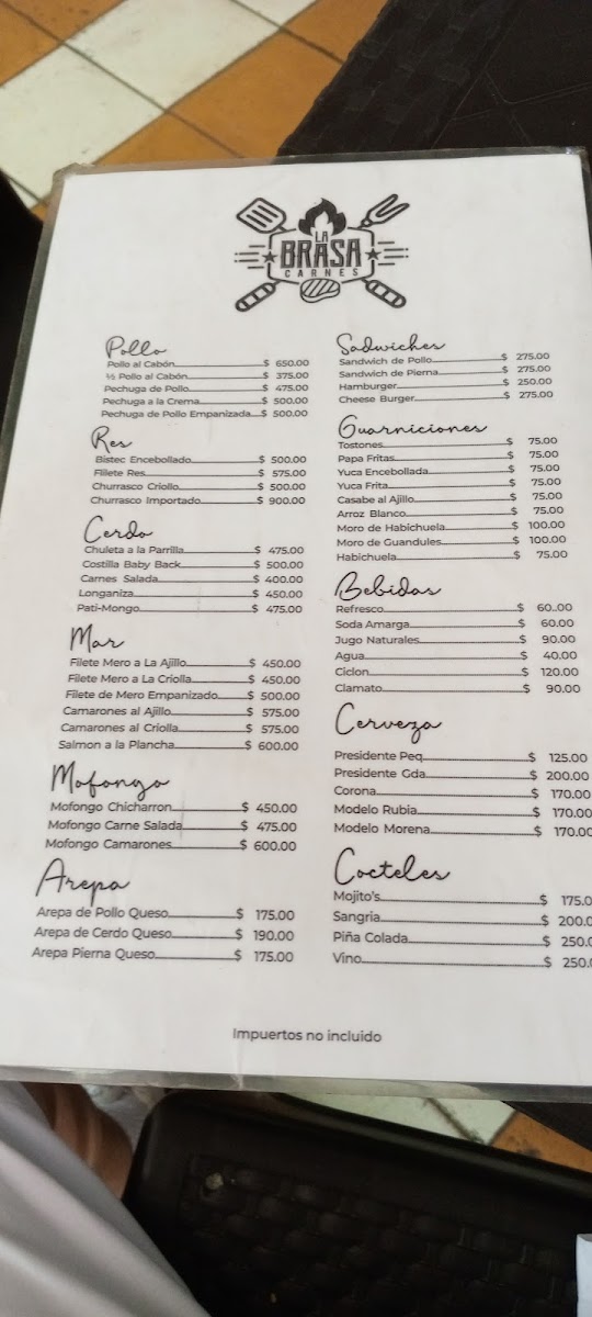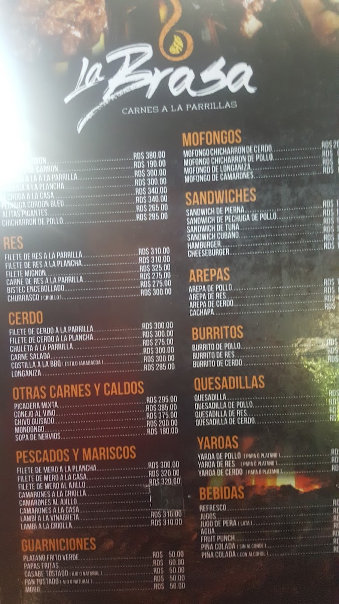 La Brasa Carnes offers a diverse and satisfying menu that combines classic Dominican flavors with a variety of options for all tastes. For those looking for side dishes, the Guarniciones section features tasty choices such as Casabe Ajillo, Yuca Encebollada, and Papas Fritas, all priced reasonably. The Cerdo (pork) selection is perfect for meat lovers, with standout options like Chuletas A La Parrilla and Costillas A La Parrilla, which bring a smoky, grilled flavor, while Carne Salada offers a salty, savory taste. Seafood enthusiasts will enjoy the Del Mar category, offering dishes like the flavorful Camarones Al Ajillo and the rich Mofongo De Camarones. Additionally, Filete De Mero Al Ajillo presents a tender fish option that pairs wonderfully with the garlic sauce.